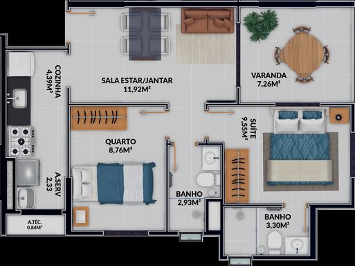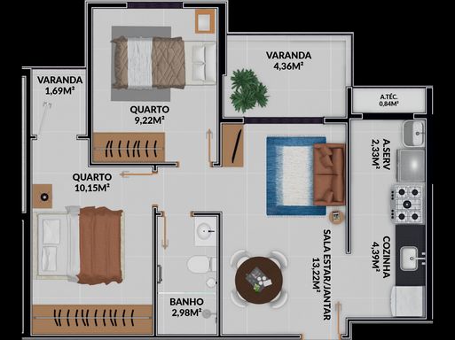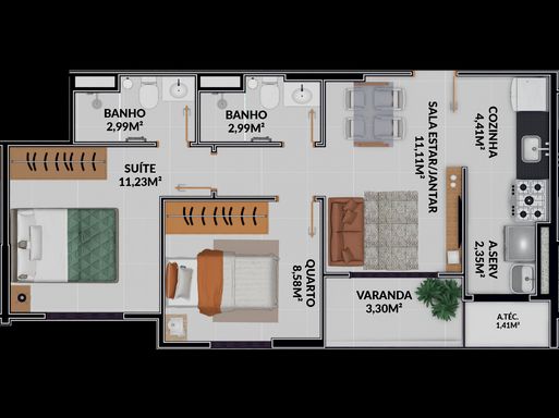 02 Quartos e 02 Quartos com suíte